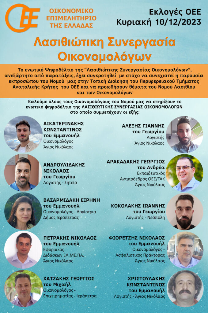 Οι Υποψήφιοι της ΛΑΣΙΘΙΩΤΙΚΗΣ ΣΥΝΕΡΓΑΣΙΑΣ ΟΙΚΟΝΟΜΟΛΟΓΩΝ για την Τοπική Διοίκηση του Περιφερειακού Τμήματος Ανατολικής Κρήτης